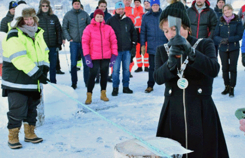 Ordfører Lilly Nyheim i Surnaldal svingte øksa og opnet Surnadal havn til stor applaus av 70 personer fra næringslivet og kommuneledelsene på Nordmøre. Kommunalsjef og daglig leder i Surnadal havneterminal Karin Halle holder i tauet.
