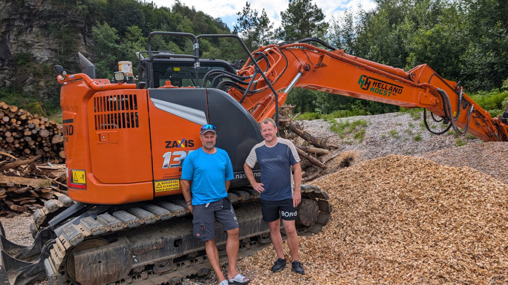 Rune Helland (t.h.) fortel at selskapet allereie har ein del skogsutstyr som vil bli nytta ved taubanedrifta. Det gjeld m.a. denne gravemaskina (Hitachi) der det vil bli montert eit nytt kvisteaggreat.