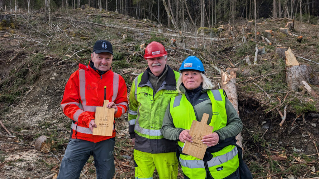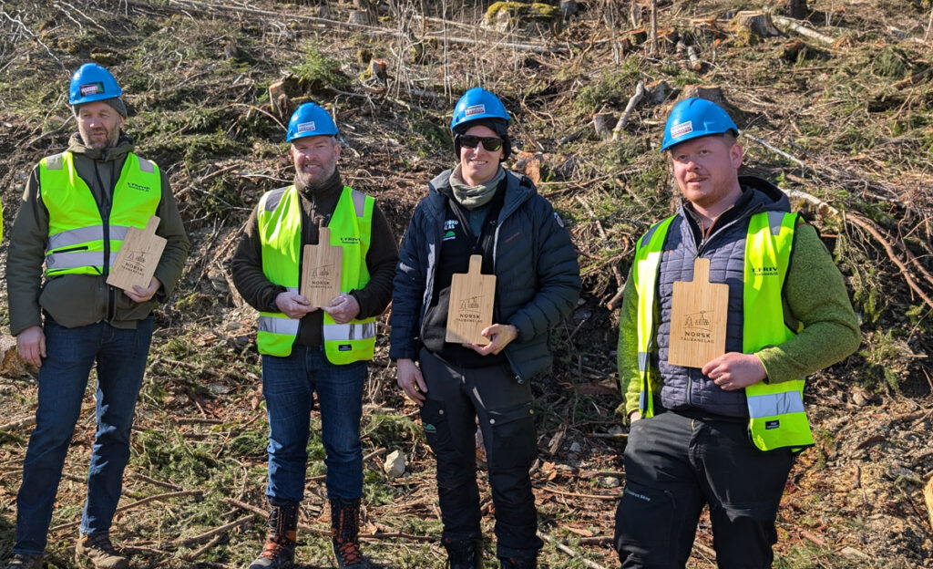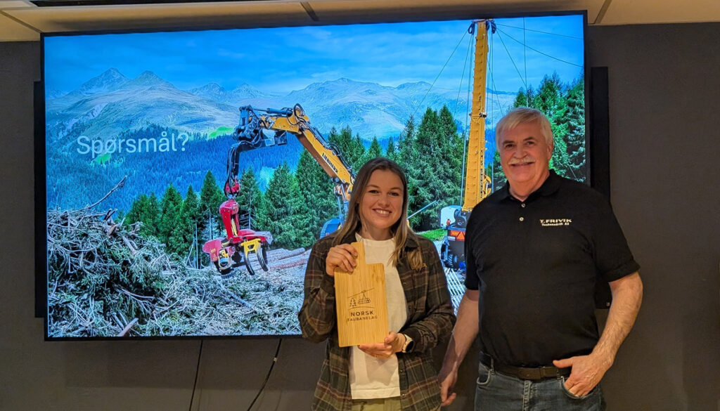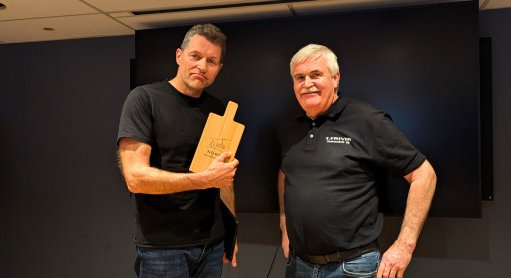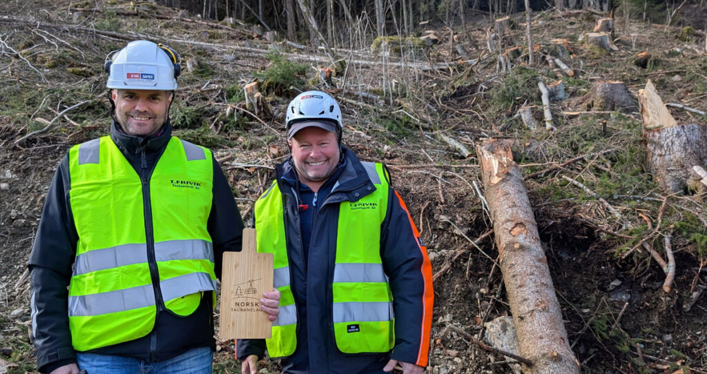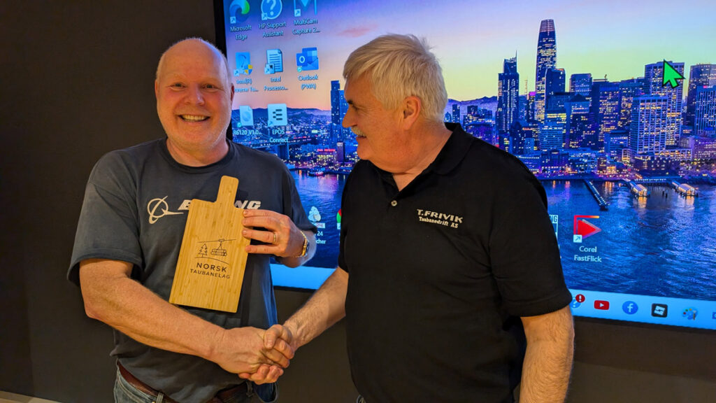 Heilt på tampen av taubanedagen kom skogeigarane Janet Lunde og Trygve Harris på besøk. Det var veldig triveleg, og Torbjørn var ikkje sein med å overrekke Skjerefjøla.