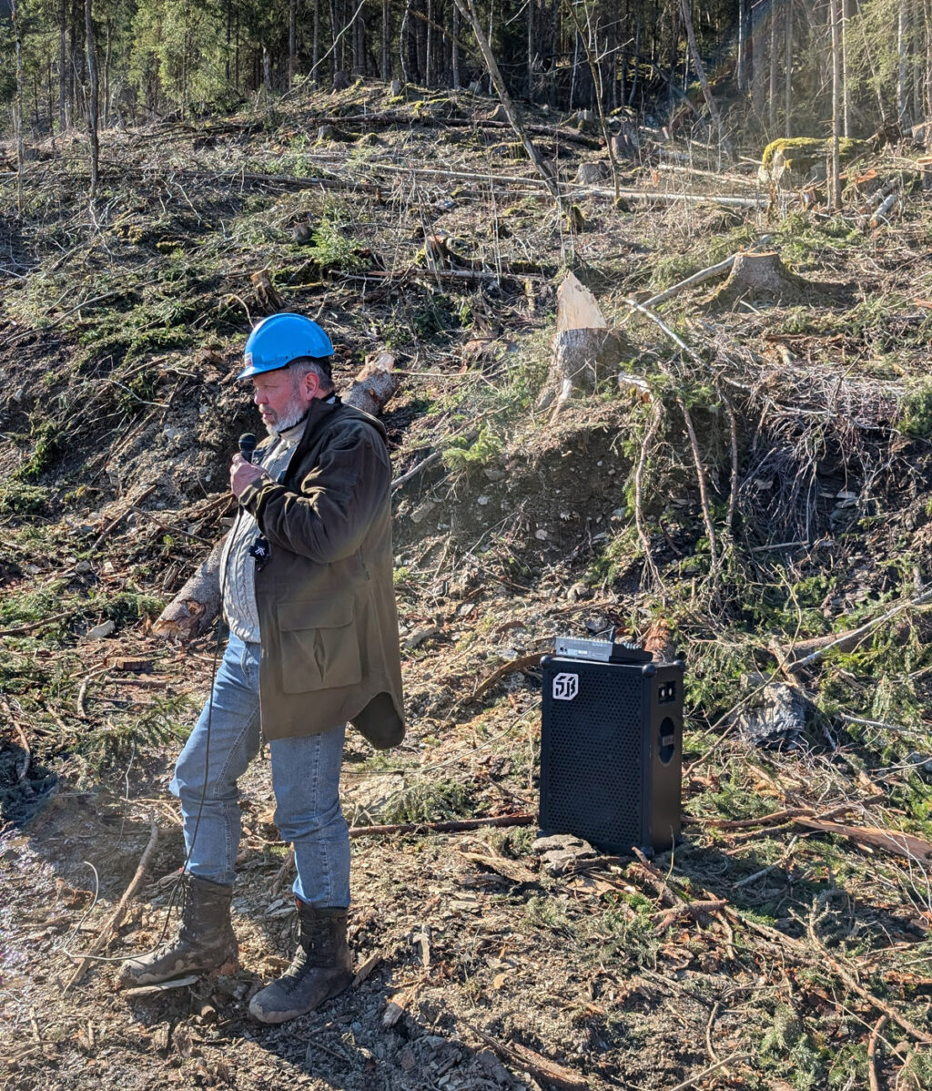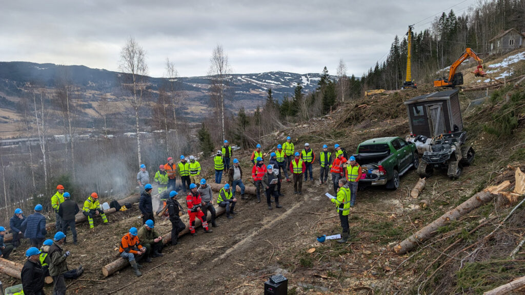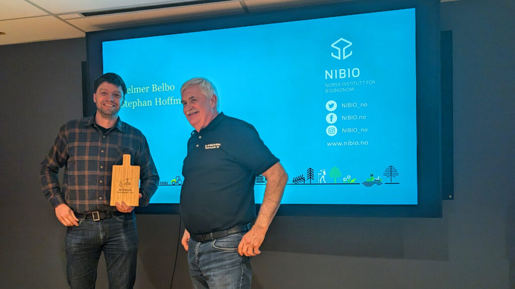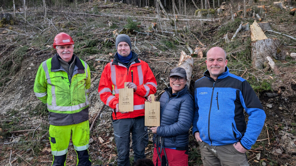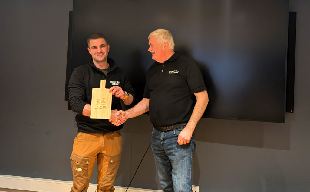 Heilt på tampen av taubanedagen kom skogeigarane Janet Lunde og Trygve Harris på besøk. Det var veldig triveleg, og Torbjørn var ikkje sein med å overrekke Skjerefjøla.
