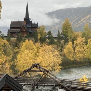Stavkirka i Lom kan være et eksempel på at vi har trengt trevirke før i tida og ikke minst trenger trevirke i det grønne skiftet. Dagens økologiske tilstand vurderes opp mot urørt tilstand. Vi må ta med nytten av tre når vi vurderer hvilket nivå den økologiske tilstanden i skog skal ligge på. Bildet viser også et variert skogbilde, der det er gode naturlige utviklingsmuligheter. I vurderinga må vi huske at norsk skog og natur er svært variert og at en rekke parametere utvikler seg i riktig retning med tanke på økologisk tilstand i skogen. Foto: Rune Hedegart