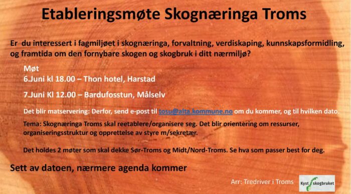 Det inviteres herved til møte om reetablering/organisering av «Skognæringa Troms». Det holdes to like møter, den 6.juni i Harstad og 7.juni på Bardufosstun i Målselv…