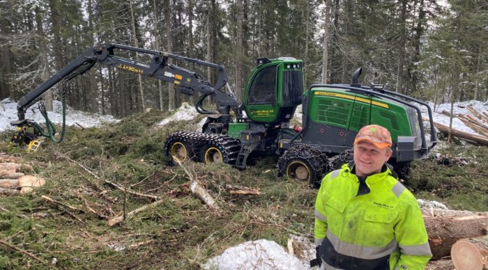 I bratte skrenter opp mot Hegra festning kjører Håvard Fossbakk hogstmaskin for Næsbø skog. Terrenget i Trøndelag er utfordrende for skogsmaskin og lastbærer, men næringa er opptatt av å ta vare på skogbunnen, kantsoner ned mot bekker og elver og planting av ny skog etter hogst.